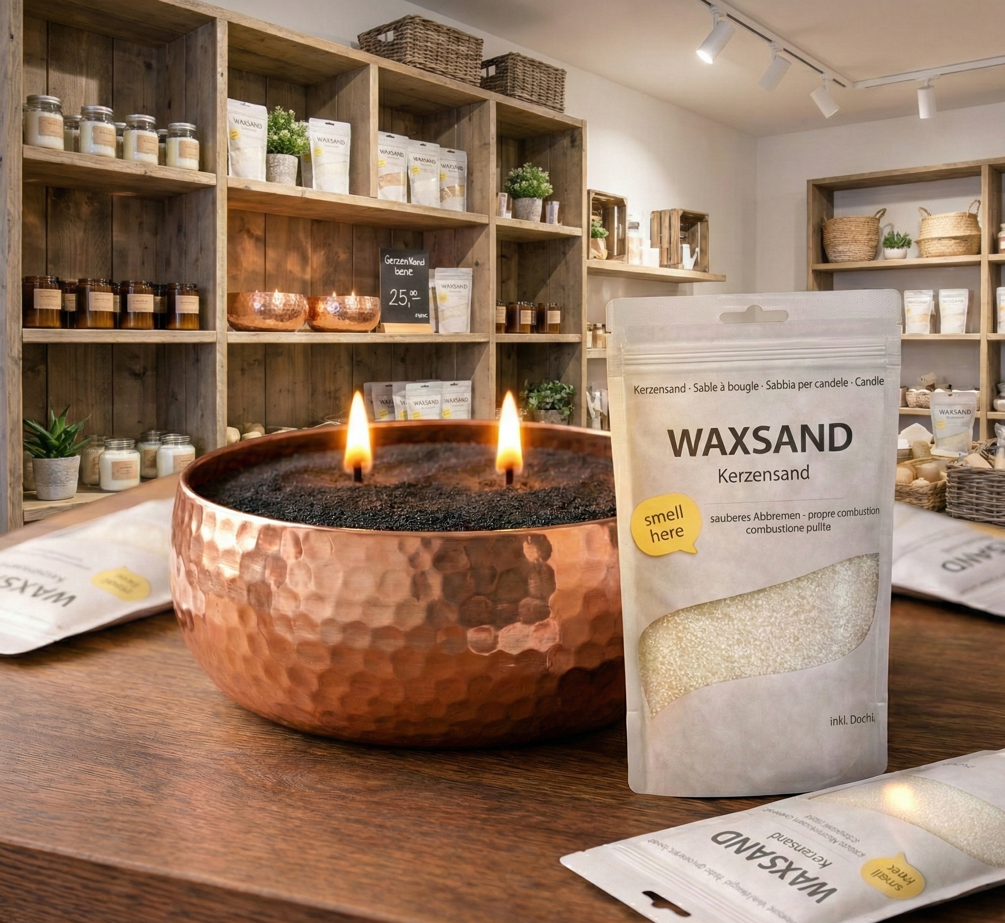 WaxSand ist ein hochwertiger Kerzensand aus 100 % pflanzlicher Basis, speziell entwickelt für den stationären Einzelhandel.